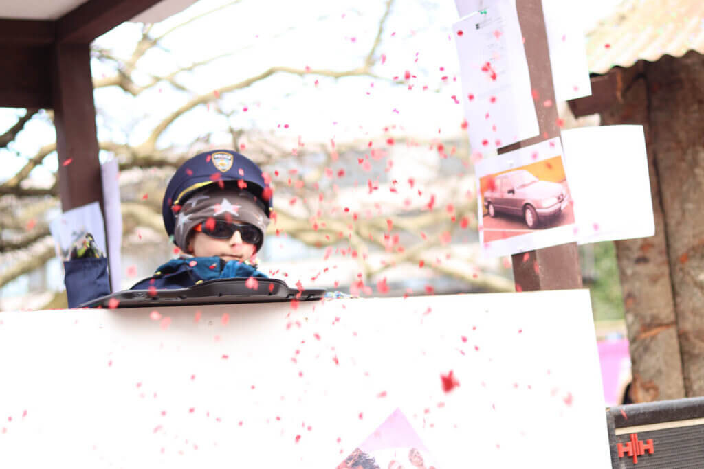 パレードの途中では、紙吹雪を拾って投げ合う子どもたちがあちこちに。