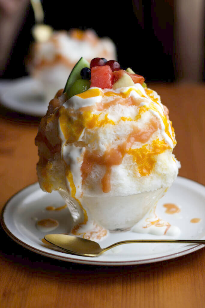 ふわふわの氷に桃ソースとマンゴーソースがかかっていて、